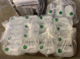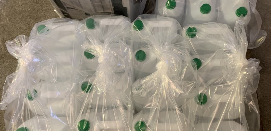 Doze bidons de desinfectante bacteriana; sete bidons de detergente liquido para loiça.